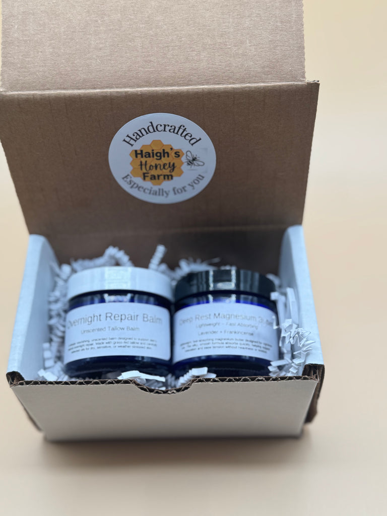 Begin with Deep Rest Magnesium Butter to help the body unwind and ease areas of tension. Follow with the Overnight Repair Balm to comfort and protect dry or stressed skin, locking in moisture without heaviness. Together, they create a calm, uncomplicated ritual that supports both physical relaxation and skin recovery.
