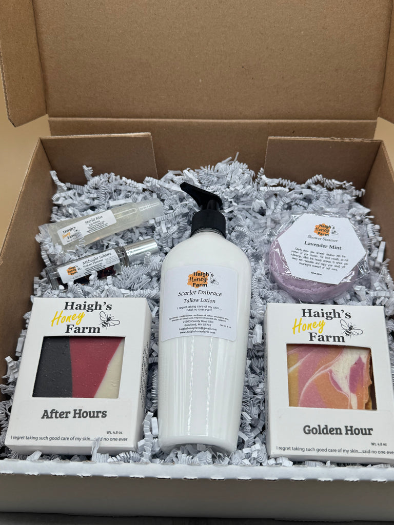 This box is filled with a full-size mix of handcrafted favorites, combining warm, comforting scents with a touch of evening elegance. From deeply nourishing tallow lotion and handcrafted soaps to a roll-on perfume, lip gloss, and an aromatic shower steamer, every item was chosen to create a complete, feel-good self-care experience.